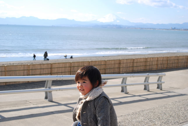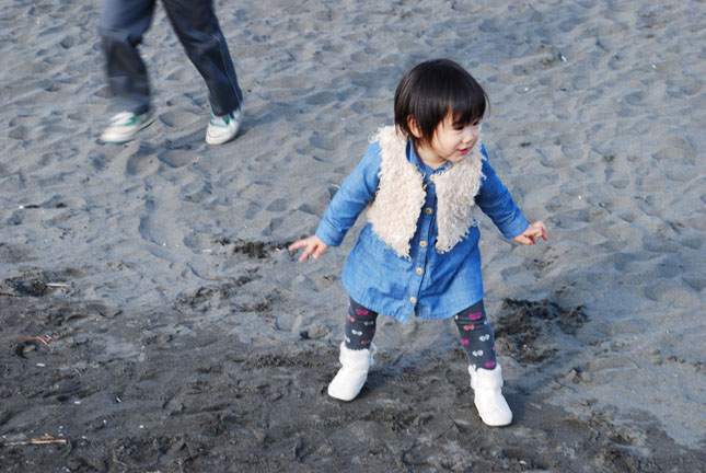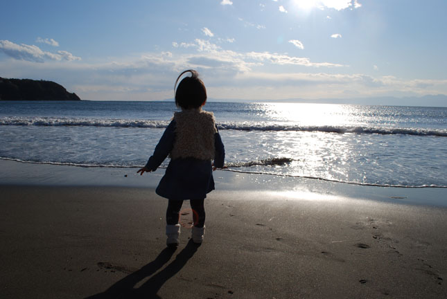海でお散歩してる人も多くて。子供には平気な寒さ