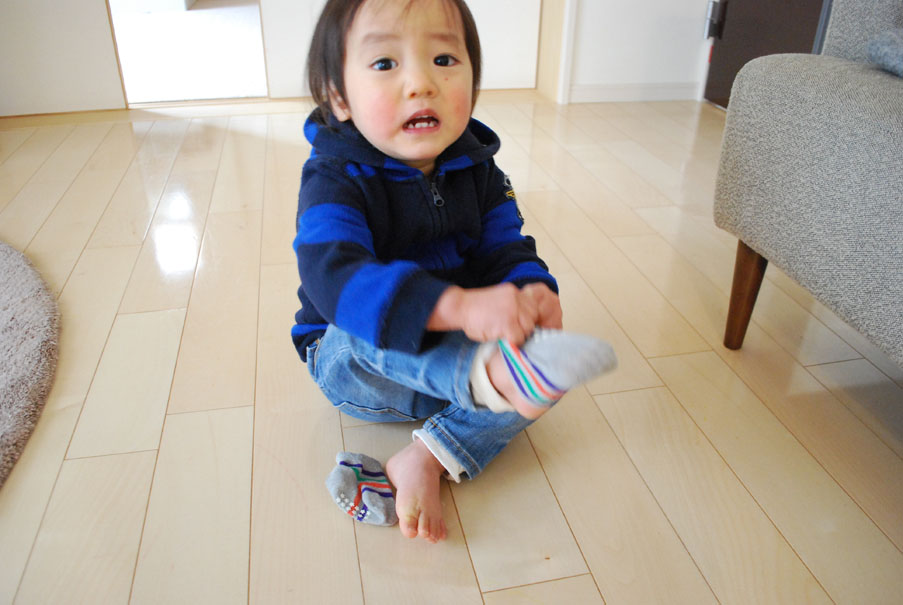 自分で靴下を履きたがるのにうまく履けなくてキーっとなってるボク。