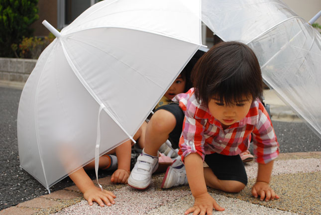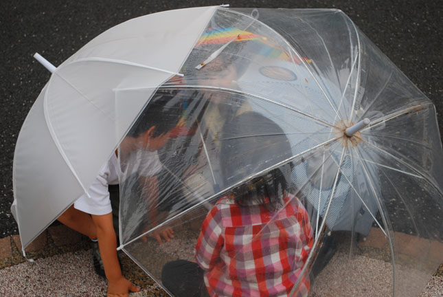 これは雨の降り出す前、傘をたくさん集めて「傘のおうち」だそう。