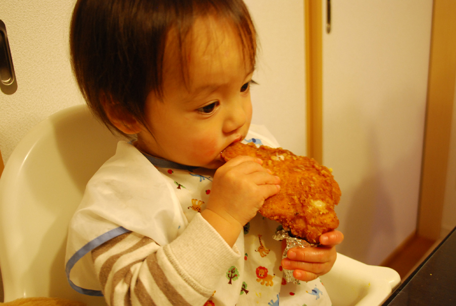 自分の顔くらいある大きなチキンにチャレンジする男子。