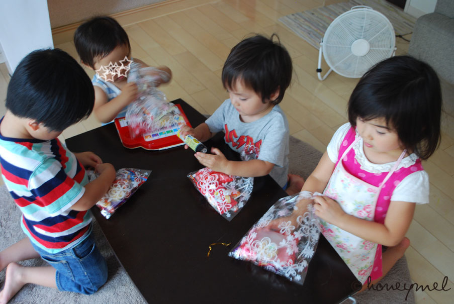 オヤツは各自いろいろ詰め込んだ袋入り。