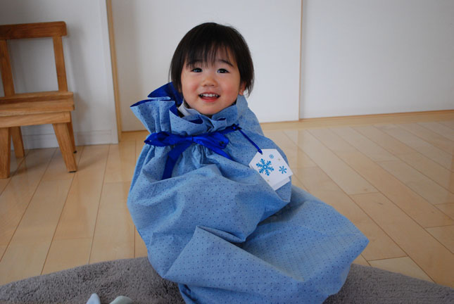 積み木の入っていたプレゼントの袋に入れられたひーこのすけ。