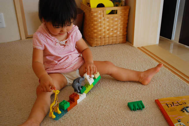我が家には電車のおもちゃがないのでブロックを電車にみたてて