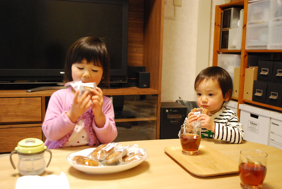 赤ちゃんへの挨拶もそこそこに着いてすぐドーナツに食いつく2人。