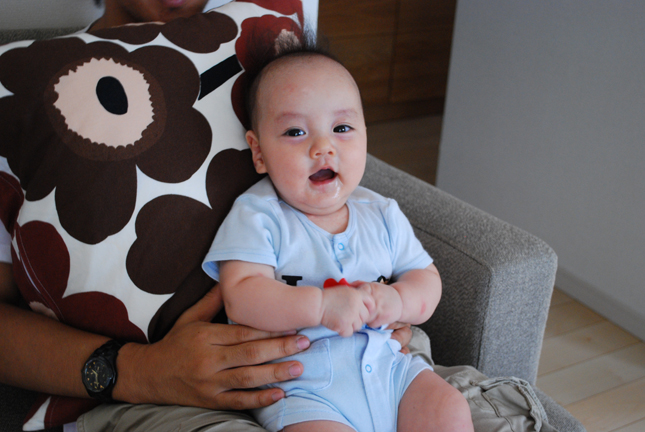 弟くんは起きたばかりで少しご機嫌ナナメ。