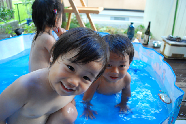 恒例の旦那さん高校同級生の集まりBBQで子供達は水遊び。
