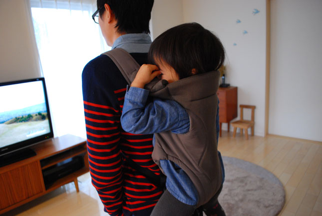 パパもひーちゃんも、お互い会えなくて寂しいだろうね。おんぶでスキンシップだね!これで、寝てくれたりする?