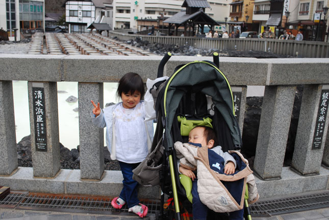 草津は山の中だから肌寒い!けどこの湯畑の周りだけはかろうじて暖かかった♪